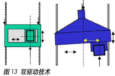 其次是采用雙驅(qū)動技術(shù)(圖13)。對于較寬工作臺或龍門架型式,如果采用中間驅(qū)動,實際無法保證驅(qū)動力在中心,容易造成傾斜,使得動態(tài)性能較差。使用雙驅(qū)動,雙光柵尺,一個驅(qū)動模塊,就能使動態(tài)性能非常完美。一個驅(qū)動指令,雙驅(qū)同時工作,光柵尺來檢測兩點(diǎn)是否平衡,如果不平衡則通過不同指令使其達(dá)到平衡。